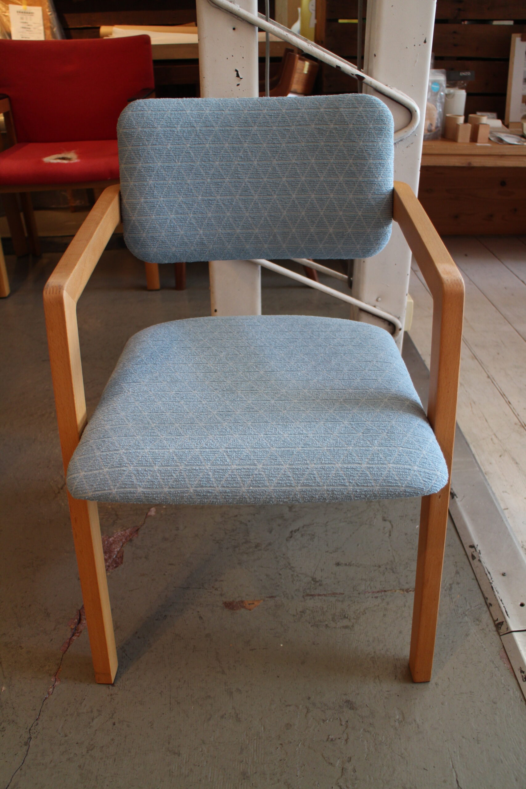 印象ある赤色から優しいライトブルーの幾何学なテキスタイルの