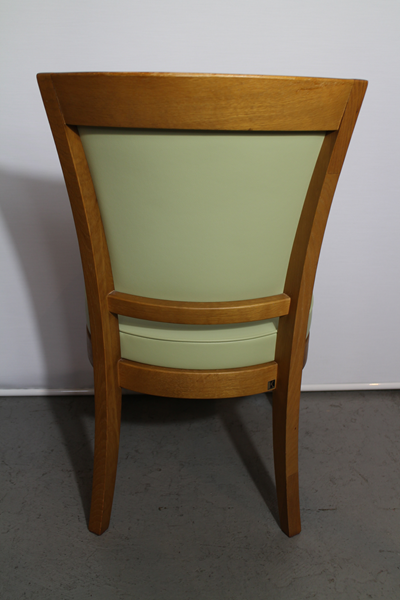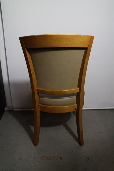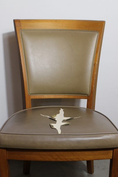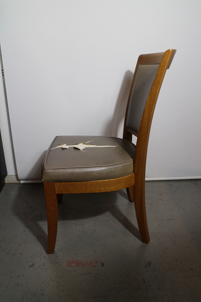 キツツキ飛騨家具の椅子 背と座面張り替えです。長い期間座ってこられ座面合皮が破れてどんどん広がってしまっている状態