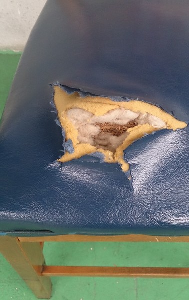 張地が破けて中が見えて中材の藁などが見えていました。ウレタンや柔らかい綿を充填し、鋲を新調して張替えています。