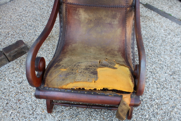 海外製のアンティークのラウンジチェアの革が傷んでしまいひび割れから破れに変っていましたので