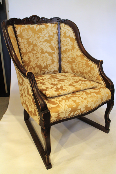 アンティークチェアの張替えです。長い時間座ってこられて座面もクタクタでした。張替える生地を華やかなものに決めて頂き