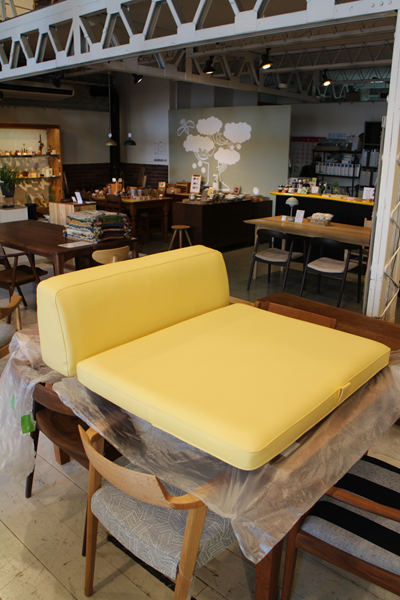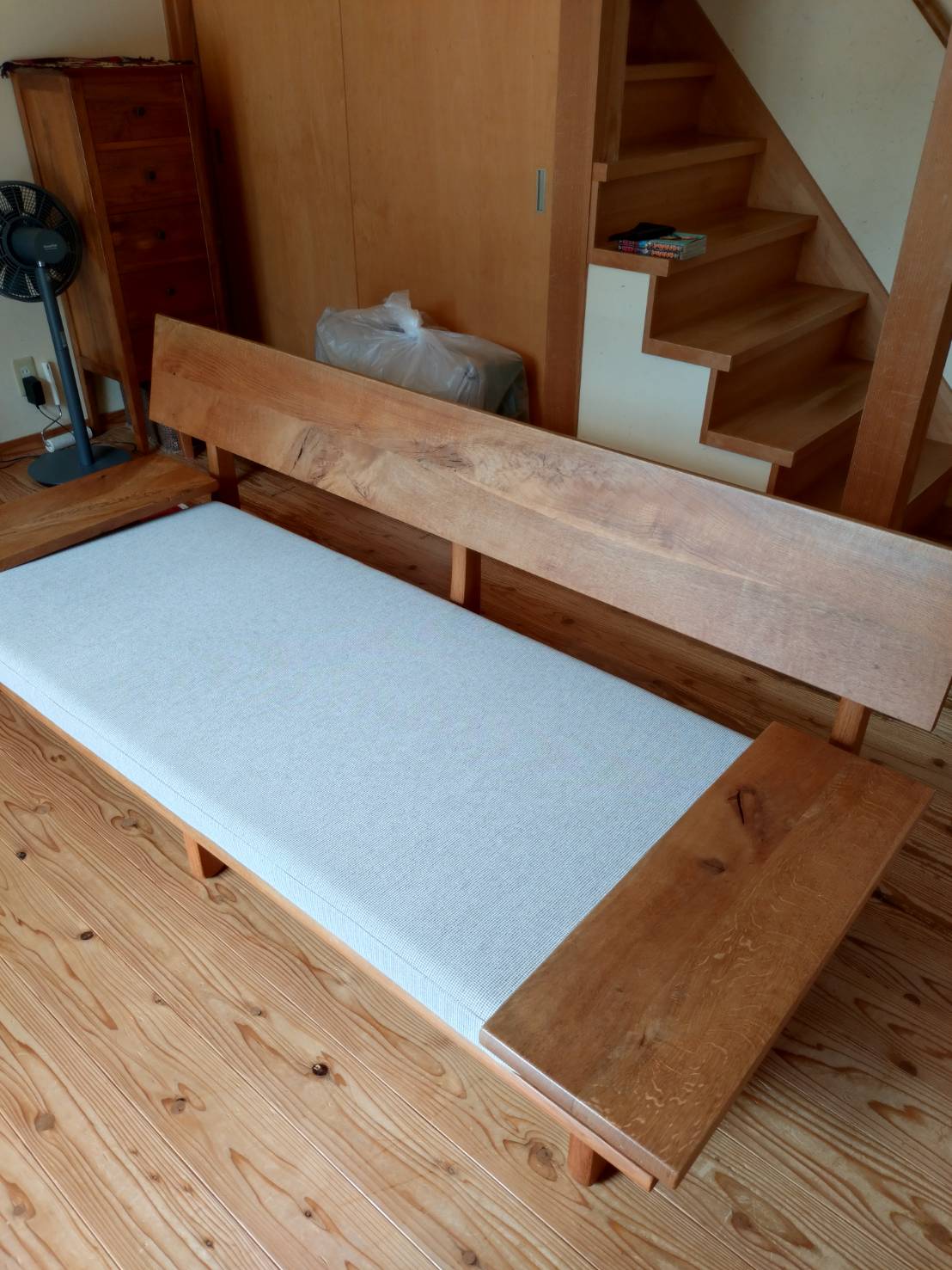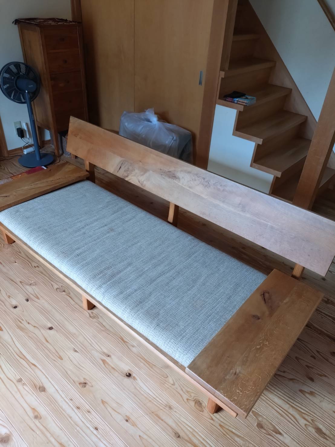 木製ソファの座面を新規に製作する依頼です。木の座面なので元々のクッションが減ってしまったので、厚みを増して座面クッションを製作いたしました。